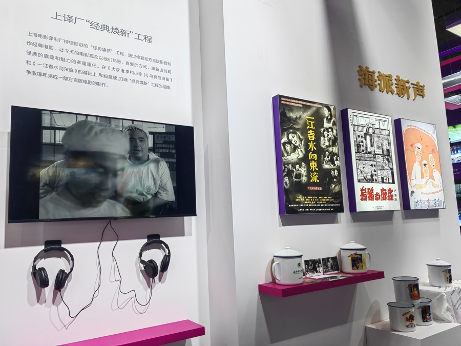 前不久,原上海电影译制厂厂长、上影集团语言表演艺术家乔榛获得中国文联终身成就奖,他对译制配音艺术的坚守和热爱让众多观众动容。在长三角文博会展台上,观众可以戴上耳机,聆听电影《大李小李和老李》《乌鸦与麻雀》《一江春水向东流》3部4K修复方言配音版电影的经典片段,感受老电影如何在方言韵律中“活”在当下。明信片、文化衫,印有《茜茜公主》《简爱》《佐罗》等经典译制片图案的巨型搪瓷杯等一系列上译文创产品也在现场亮相,吸引众多人欣赏、购买。上译党政办主任许菁介绍,3000ml巨型搪瓷杯是现场最受欢迎的产品,这些文创杯子的原型是老艺术家们当年夏天在录音棚工作时,解乏消暑喝盐汽水用的搪瓷杯。